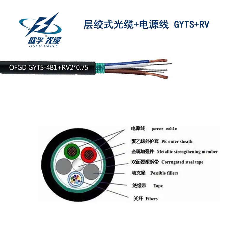歐孚 GYTS - 4B1 + RVV 2*1.0 光電混合纜是一款將光纜與電源線集于一體的高性能線纜產品,旨在為用戶提供高效、便捷的通信與電力傳輸解決方案。它結合了光纖通信的高速、大容量和穩定可靠以及電力傳輸的實用性,適用于多種場景,滿足不同用戶的需求。